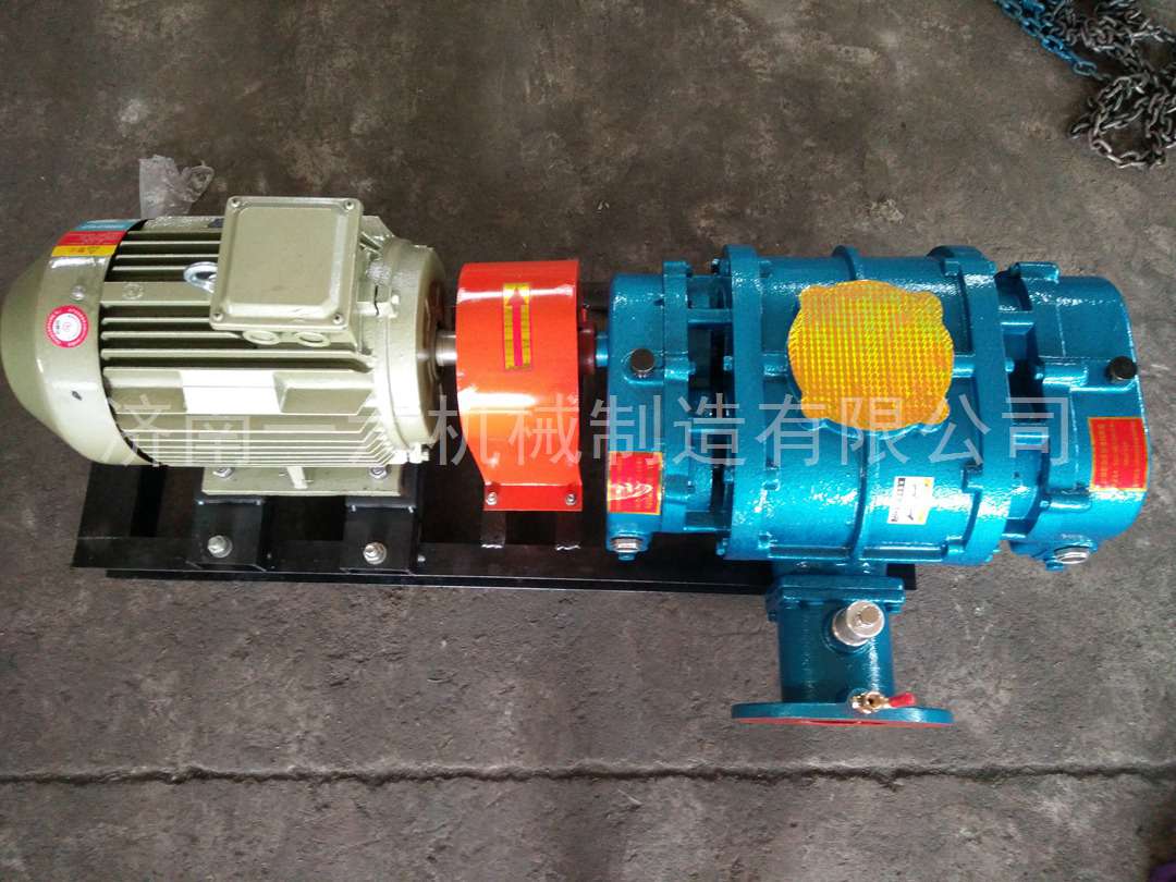 雙級(jí)串聯(lián)羅茨風(fēng)機(jī)是一種由兩臺(tái)羅茨風(fēng)機(jī)串聯(lián)組成的裝置。每臺(tái)風(fēng)機(jī)箱體內(nèi)部均有兩個(gè)轉(zhuǎn)向相反的三葉型轉(zhuǎn)子,每個(gè)三葉型轉(zhuǎn)子用兩個(gè)軸承支撐,利用一對(duì)高精度的同步直齒輪,使兩個(gè)轉(zhuǎn)子的相對(duì)位置始終保持不變,轉(zhuǎn)子之間以及轉(zhuǎn)子與箱體之間保持一定的間隙,無(wú)接觸旋轉(zhuǎn)。轉(zhuǎn)子在側(cè)箱體同步齒輪的驅(qū)動(dòng)下,借助兩轉(zhuǎn)子的“嚙合”,使進(jìn)氣口與出氣口相互隔開(kāi),完成箱體和轉(zhuǎn)子間的密閉氣體從吸入側(cè)到吐出側(cè)的移送過(guò)程。在旋轉(zhuǎn)過(guò)程中無(wú)內(nèi)壓縮地將工作腔內(nèi)的氣體從進(jìn)氣口推移到出氣口。轉(zhuǎn)子與轉(zhuǎn)子、轉(zhuǎn)子與箱體、轉(zhuǎn)子與墻板之間都有微小間隙,因而工作腔內(nèi)沒(méi)有摩擦,無(wú)接觸磨損部分。
