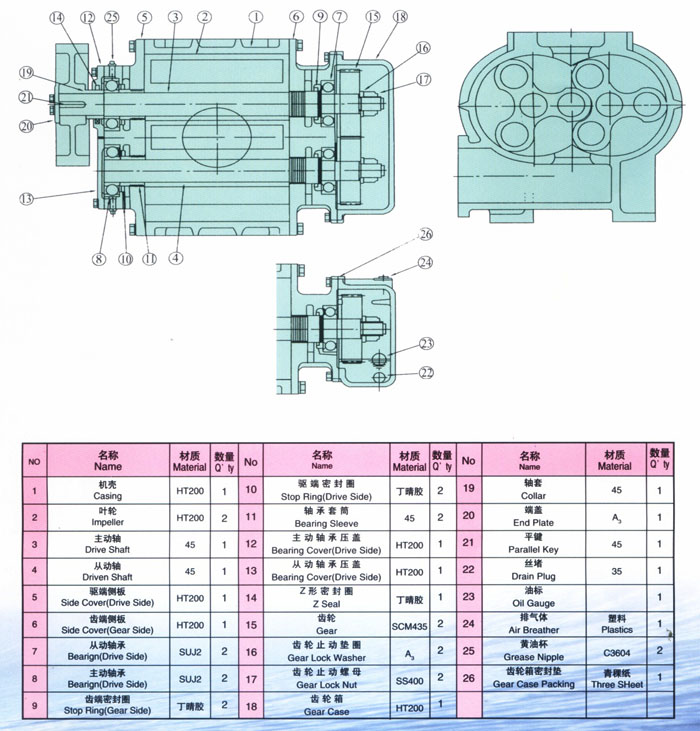 三葉羅茨風(fēng)機(jī)主要用作排氣的機(jī)械設(shè)備,三葉羅茨鼓風(fēng)機(jī)的優(yōu)點(diǎn)是,在中心距離和外圓半徑相同的情況下,弧葉型三葉轉(zhuǎn)子羅茨鼓風(fēng)機(jī)比兩葉的位移大。漸開線葉型羅茨鼓風(fēng)機(jī)的位移與轉(zhuǎn)子的頭數(shù)無關(guān)。三葉轉(zhuǎn)子羅茨鼓風(fēng)機(jī)的振動(dòng)和噪音比二葉小,三葉轉(zhuǎn)子使用的軸承壽命比二葉使用的長約15%。另外,三葉轉(zhuǎn)子可以使用扭轉(zhuǎn)轉(zhuǎn)子來減少噪音和振動(dòng),二葉轉(zhuǎn)子由于結(jié)構(gòu)限制,不能使用扭轉(zhuǎn)葉片結(jié)構(gòu)。三葉轉(zhuǎn)子的力學(xué)性能比較好,比二葉更能保證葉輪之間和葉輪與外殼之間的間隙。三葉轉(zhuǎn)子羅茨鼓風(fēng)機(jī),特別是扭曲的葉型,噪音和動(dòng)平衡性能好,在汽車機(jī)械增壓方面的應(yīng)用越來越多。